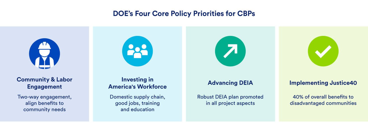 DOE requires CBPs as part of all funding opportunity announcements that come through the Bipartisan Infrastructure Law and the Inflation Reduction Act. These CBPs are designed to achieve four outcomes: