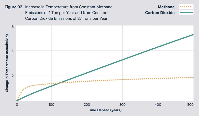 Figure 2 shows the increase in average global surface temperature with sustained emissions of 1 ton of methane per year for 500 years, compared to sustained emissions of 27 tons of carbon dioxide per year. The rationale for this comparison is that, according to the GWP100 metric, 1 ton of methane per year over 100 years warms the climate by about as much as 27 tons of carbon dioxide per year over the same period. These emissions are equivalent in terms of their GWP, but we see that the dynamics of the temperature responses are very different.