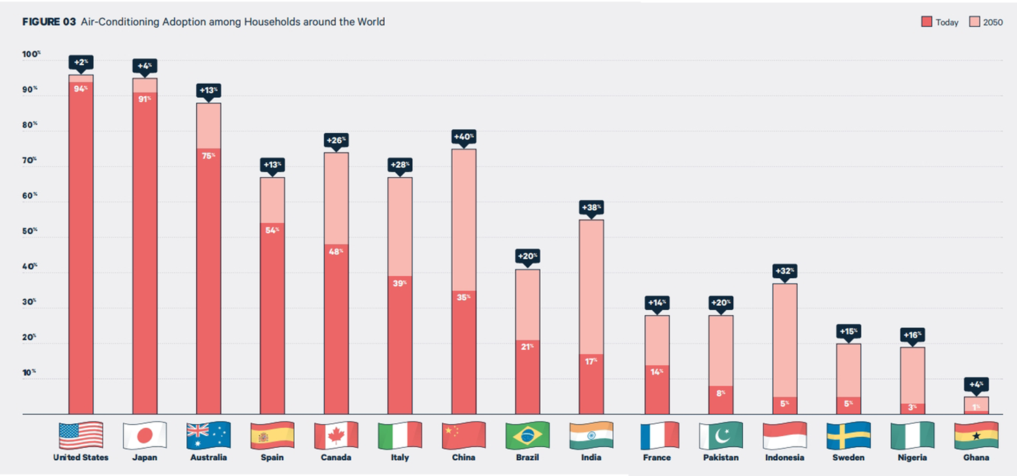 Deadly heat waves currently endanger the health of populations worldwide; due to their increasing frequency, heat waves are no longer “extreme” weather events. Air-conditioning has emerged as the predominant global strategy to cool buildings and mitigate the health effects of heat. This Chart of the Week, from the scientific and photographic project The Cooling Solution, featured in the new issue of Resources magazine, illustrates the expected growth in the adoption of air-conditioning in households around the world. While Western countries historically have used the most air-conditioning, populous countries in tropical regions are expected to acquire billions of air-conditioning units by midcentury to stay cool in an increasingly hot world. Architects and scientists are exploring alternative, low-carbon technologies that incorporate traditional architectural principles, such as shading and passive cooling. These strategies could help reduce reliance on conventional air-conditioning systems and the accompanying emissions.