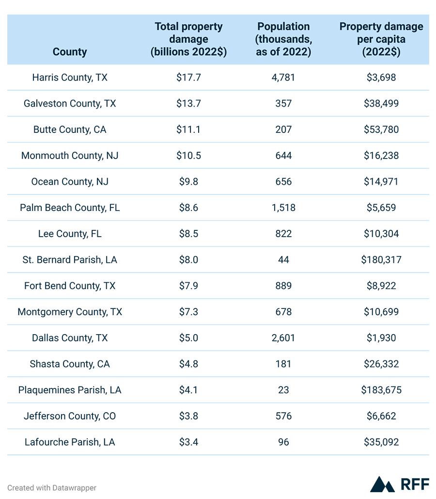 Notes: The counties are listed from top to bottom according to the total amount of property damage they experienced from 1995 to 2022. Harris County, Texas, experienced the most damage, and Lafourche Parish, Louisiana, experienced the least damage.