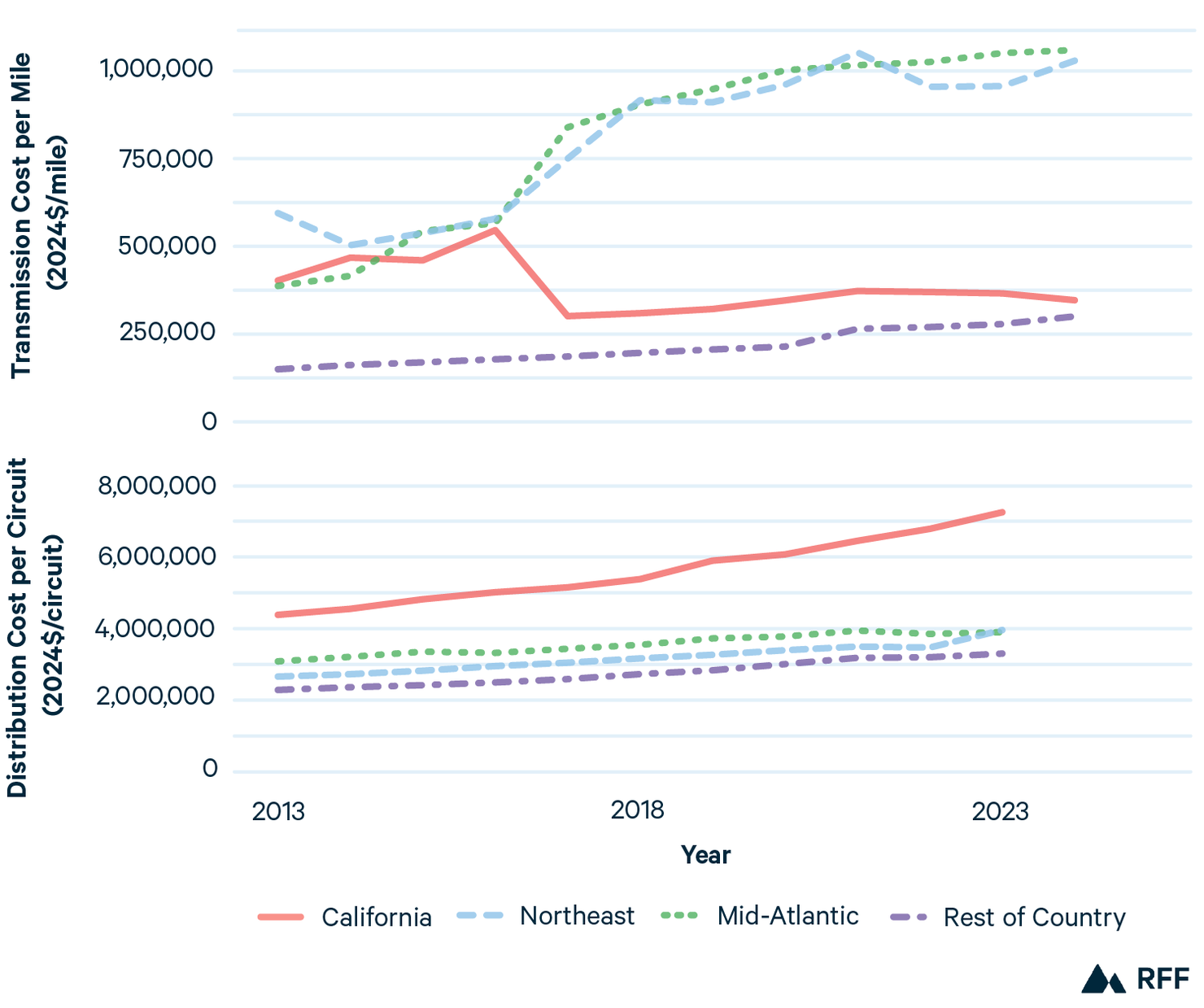 Nationally, inflation-adjusted transmission costs per mile have increased 98.8% since 2013, with especially large increases in the Northeast and Mid-Atlantic. Inflation-adjusted distribution costs per circuit increased 42.5% over the same period, with especially large increases in California. These cost increases come as net growth in transmission miles and distribution circuits has remained roughly unchanged.