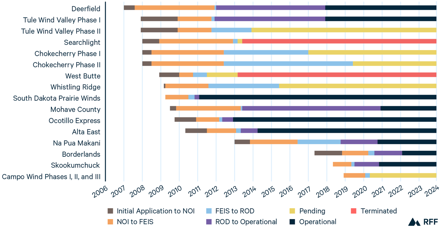 For wind projects, 3 of 10 went from initial action to operation within five years; but 4 wind projects required more than eight years. For the post-NEPA review period, 11 of 24 solar projects and 6 of 14 wind projects required more than four years to complete construction and begin operation from the date that a record of decision had been issued. This delay in completing construction and beginning operation suggests that these projects encountered additional obstacles after the formal NEPA review process.