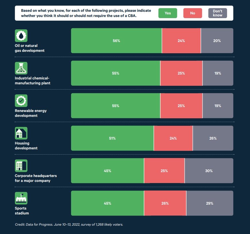 Survey respondents polled by the nonprofit Data for Progress show substantial support for the mandatory use of CBAs for energy and industrial infrastructure projects, in addition to the construction of new housing, sports, and business centers (Figure 1).
