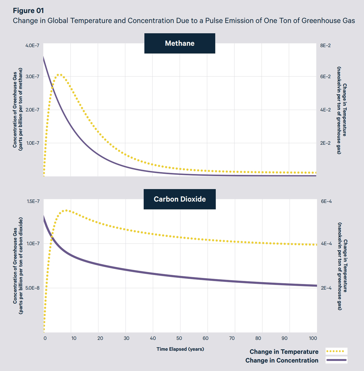 Figure 1 shows the concentration and temperature responses associated with one unit emission of each respective greenhouse gas. The concentration immediately starts to fall after the pulse emission. The temperature response, in contrast, first lags behind the concentration response, then lingers for a longer period of time, which reflects the inertia of the climate system.