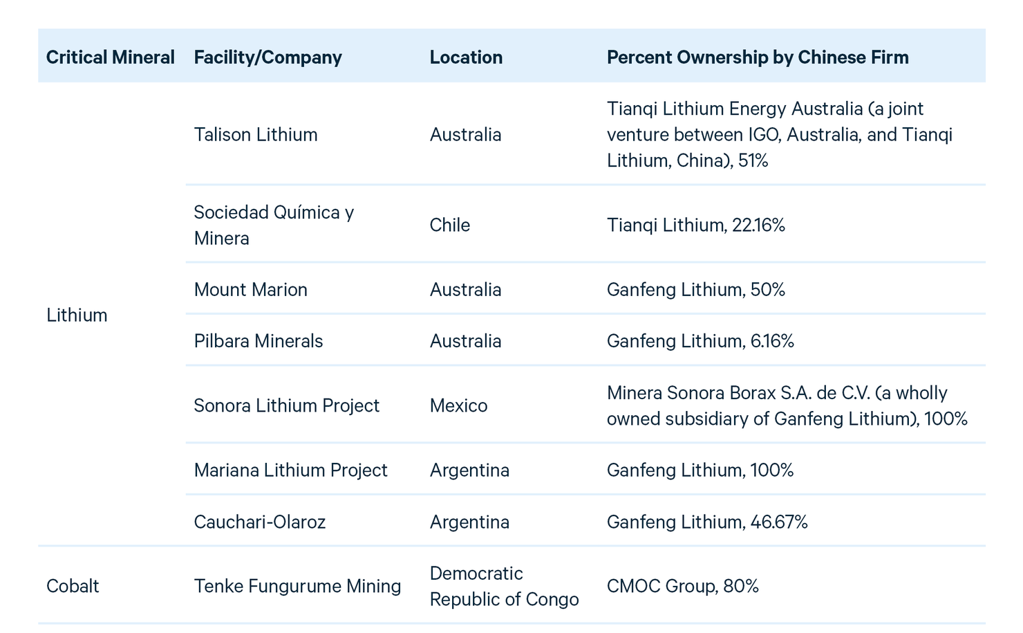 Table 1. Examples of Chinese-Owned Lithium and Cobalt-Mining Facilities outside China