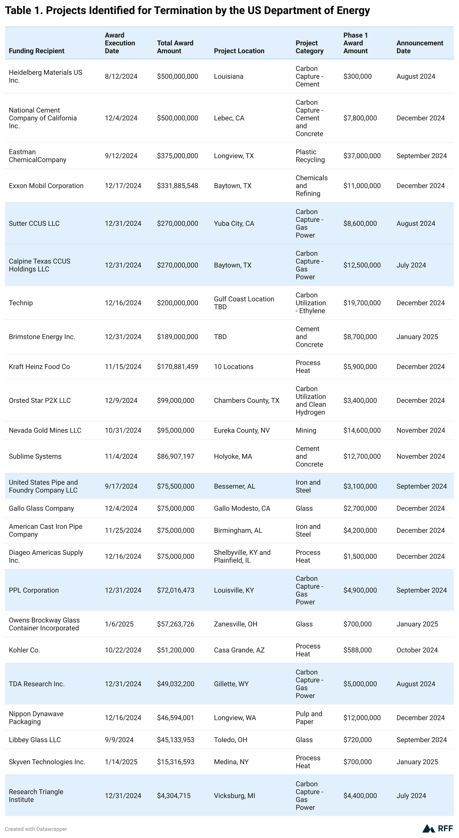 Our amended project list conflicts somewhat with DOE statements about the timing and cost savings associated with DOE’s terminations. For example, DOE stated that nearly 70 percent (16 of the 24 projects) were signed between Election Day 2024 and January 20, 2025; however, six of these projects (highlighted in blue) were signed much earlier. For example, the Calpine Texas CCUS Holdings LLC project was listed in the termination notice from DOE with its termination notice with an “award execution date” of December 31, 2024, but the Biden administration’s DOE announced that the project had been awarded the first payment of $12.5 million on July 3, 2024.